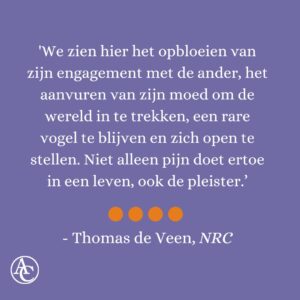 In zijn autobiografische portret is haar spiegeling, dat wat van haar in hem zichtbaar wordt, dusdanig bepalend dat er ook echt iets nieuws gebeurt binnen Van Dis’ oeuvre: we zien hem iets krijgen wat zijn vader en moeder hem niet gaven. We zien hier het opbloeien van zijn engagement met de ander, het aanvuren van zijn moed om de wereld in te trekken, een rare vogel te blijven en zich open te stellen. Niet alleen pijn doet ertoe in een leven, ook de pleister.’